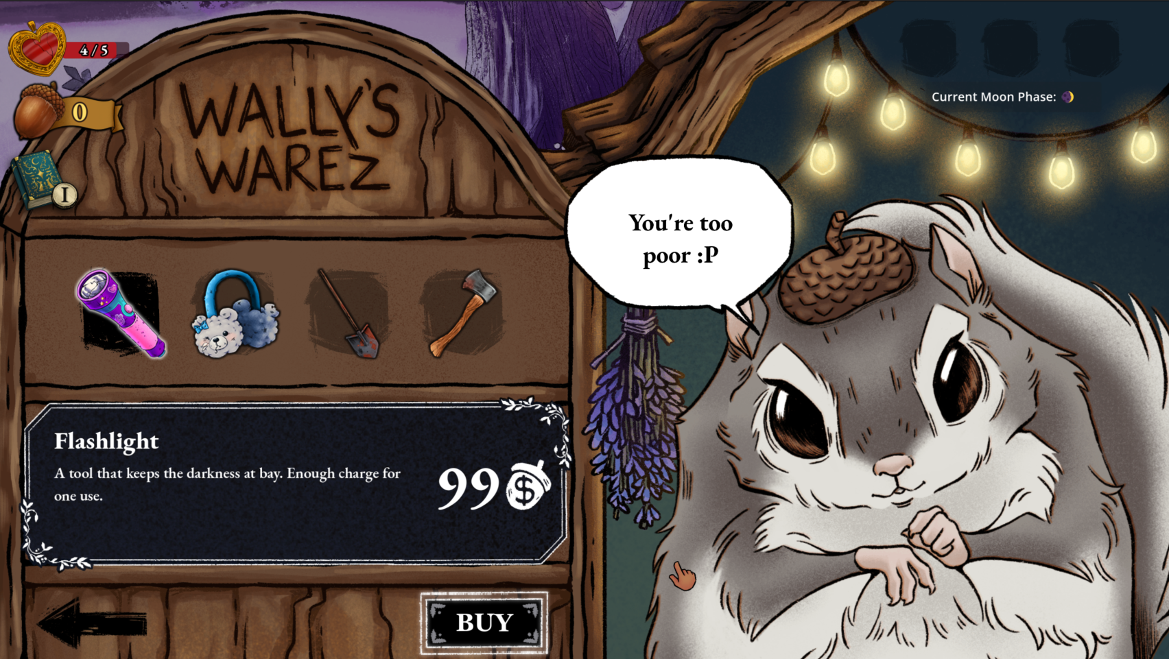 The following depicts the Shop Keep’s Idle Portrait Animation, as well as the currency used in game (acorn), his Isometric Idle Animation, and Traveling Shop.